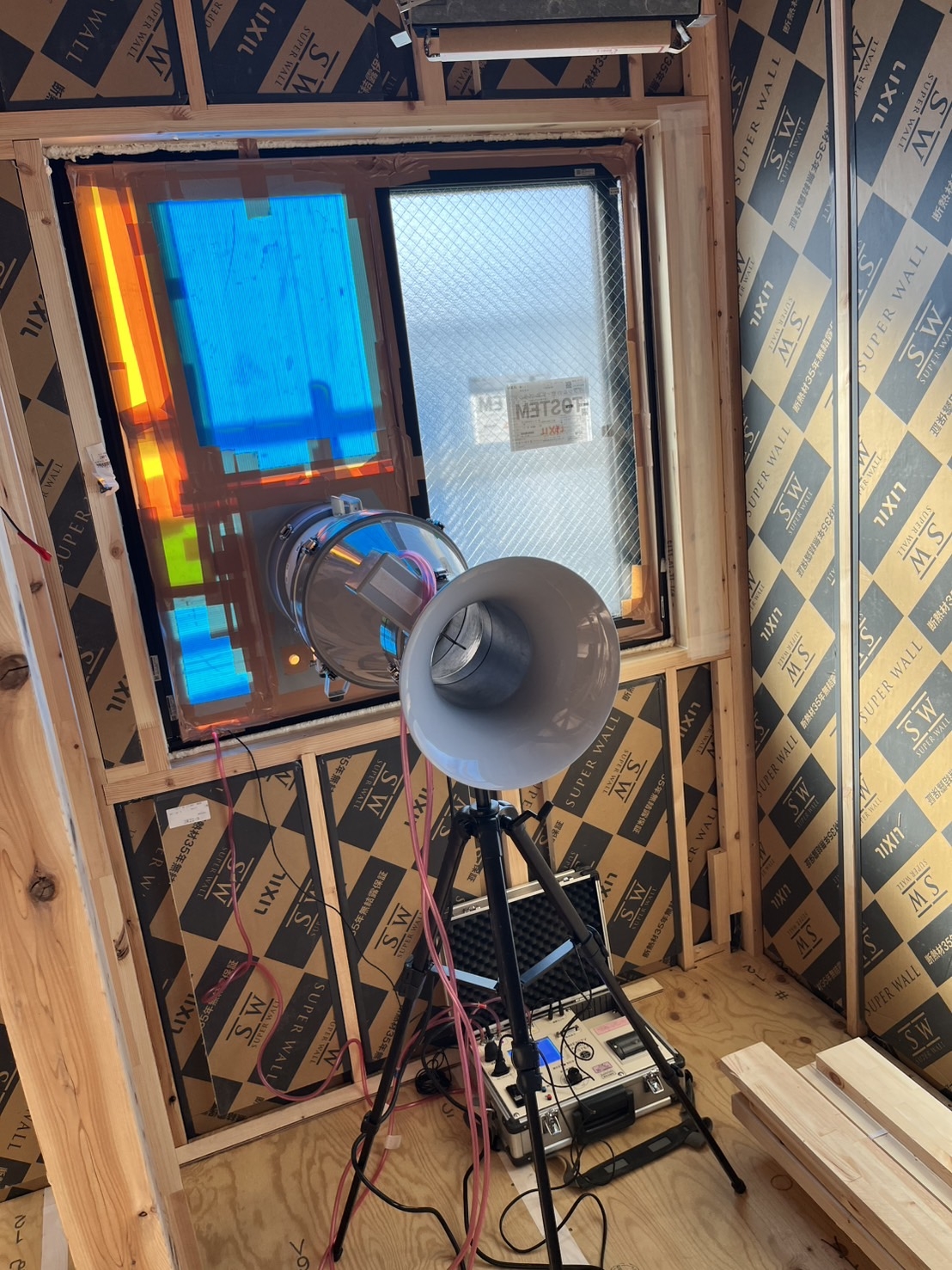 強風の中SW工法気密測定をおこないました。